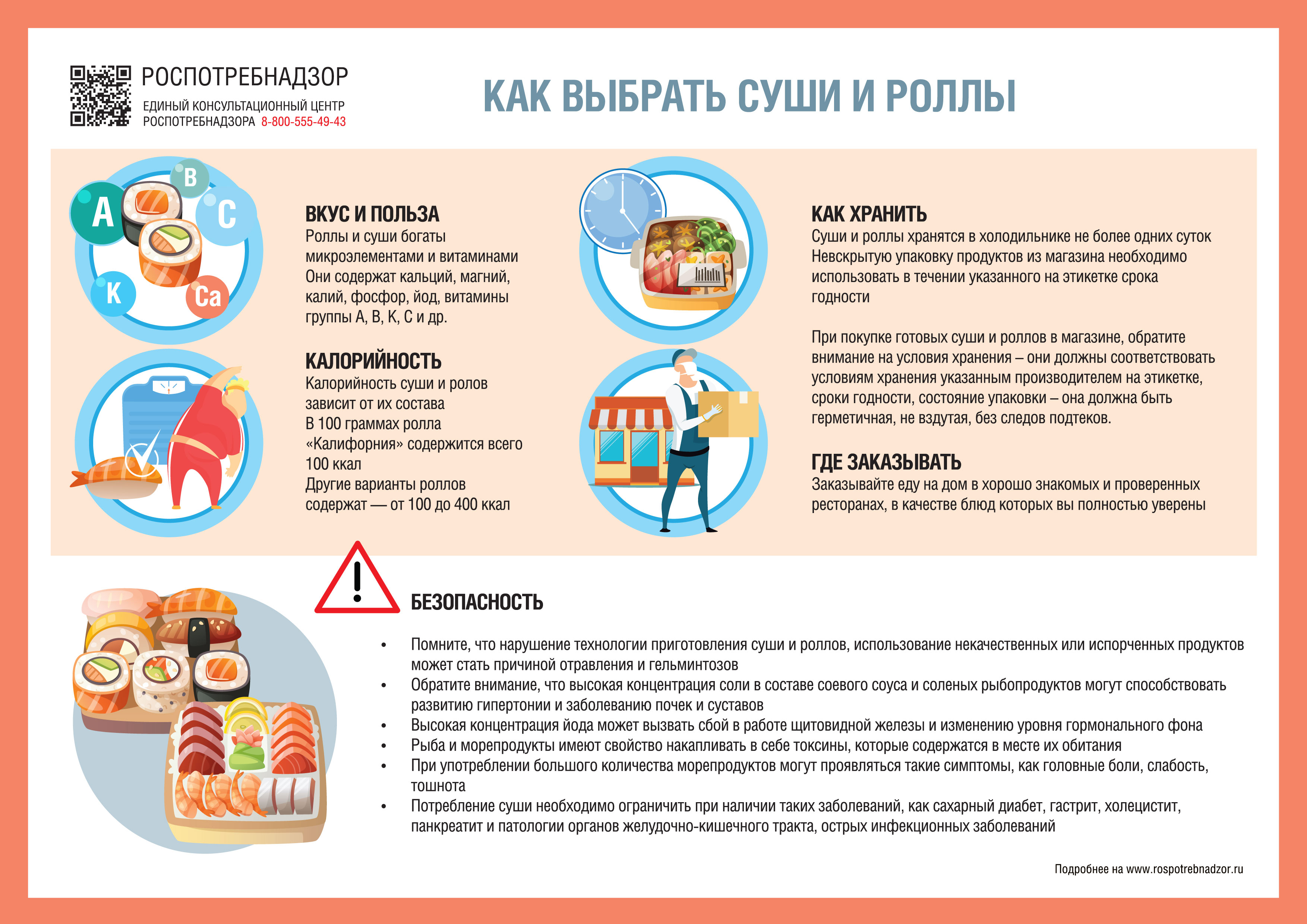 О рекомендациях как выбрать суши и роллыПресс-центр → Пресс-релизыУправление Роспотребнадзора по Ставропольскому краю информирует: Суши и роллы – популярное блюдо юго-восточной кухни, изобретенное китайскими моряками – для сохранения свежей рыбы ее пересыпали рисом. Сегодня это популярный сегмент фаст-фуда и ресторанной кухни. Основным компонентом и роллов и суши является рис, но суши – это рисовая основа, на которую положена начинка, а роллы – это нарезанный рулет, состоящий из нескольких компонентов (рис, морепродукты, огурец и т.д. Роллы и суши, благодаря множеству входящих в них компонентов, богаты микроэлементами и витаминами. Основными среди них являются кальций, магний, калий, фосфор, йод, витамины группы А, В, К,С и ряд других. Калорийность суши и роллов зависит от их состава. Например, в 100 граммах ролла «Калифорния» содержится всего 100 ккал. Другие варианты роллов могут быть гораздо более калорийными — от 100 до 400 ккал. Роспотребнадзор напоминает, что при нарушении технологии приготовления суши и роллов и использовании некачественных или испорченных продуктов возникает риск отравления и гельминтозов. Кроме того, высокая концентрация соли в составе соевого соуса и соленых рыбопродуктов могут способствовать развитию гипертонии и заболеванию почек и суставов. Высокая концентрация йода может вызвать сбой в работе щитовидной железы и изменению уровня гормонального фона. Рыба и морепродукты имеют свойство накапливать в себе токсины, которые содержатся в месте их обитания. При употреблении большого количества морепродуктов могут проявляться такие симптомы, как головные боли, слабость, тошнота. Потребление суши необходимо ограничить при наличии таких заболеваний, как сахарный диабет, гастрит, холецистит, панкреатит и патологии органов желудочно-кишечного тракта, острых инфекционных заболеваний. Роллы и суши, купленные в магазине или приготовленные самостоятельно, должны хранится в домашнем холодильнике не более 1 суток, невскрытую упаковку продуктов из магазина необходимо использовать в течении указанного на этикетке срока годности. При покупке готовых суши и роллов в магазине, обратите внимание на условия хранения – они должны соответствовать условиям хранения указанным производителем на этикетке, сроки годности, состояние упаковки – она должна быть герметичная, не вздутая, без следов подтеков. Заказывать готовую еду на дом по интернету рекомендуется в хорошо известных вам местах, где вы уже были и пробовали продукцию. Выберите ближайший к вам ресторан, желательно тот, который находится в вашем районе. Прежде чем сделать заказ, позвоните по телефону ресторана, а не по указанному на сайте и уточните, делают ли они доставку продукции по заказу и правильный ли телефон указан на сайте доставки. Под видом реально существующего ресторана в интернете могут быть сайты-двойники, реализующие продукцию сомнительного качества и опасную для жизни и здоровья. В этом случае есть риск сделать заказ на доставку еды мошенникам и последствия могут быть самыми непредсказуемыми. По информации сайта www.rospotrebnadzor.ru При использовании информации ссылка на сайт Управления Роспотребнадзора по Ставропольскому краю обязательна. 25.12.2020, 86 просмотров. |